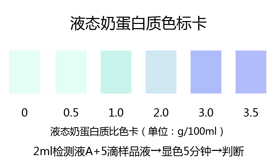 1.3:取2ml蛋白質檢測試劑于比色管中,加入5滴樣品液,振搖混勻5分鐘后,觀察顏色變化并與標準比色卡對比。