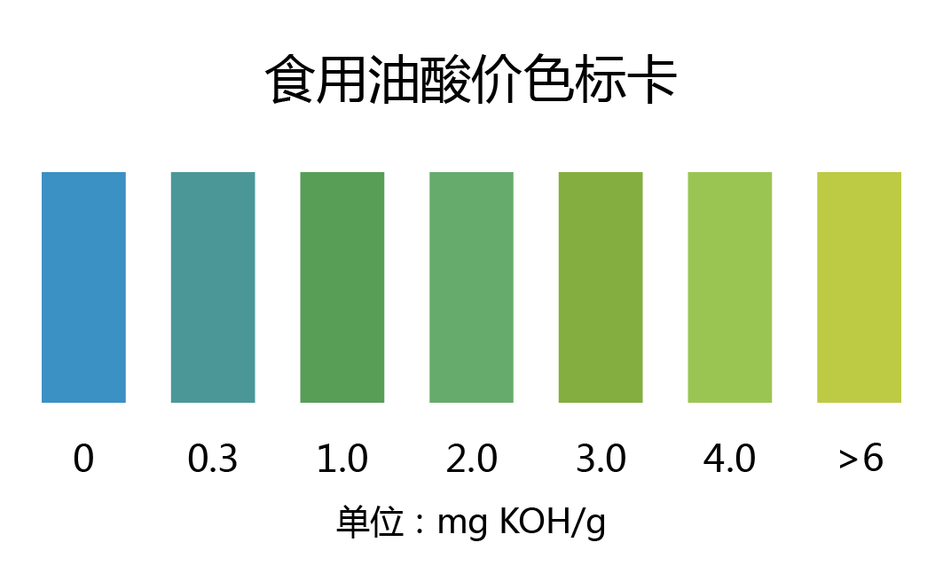 1.1:取一條酸價檢測試紙浸入油樣中半秒鐘取出,5min后立即與標準色卡比較,找出與對照色卡上相近的色階即為食用油酸價的大致含量;