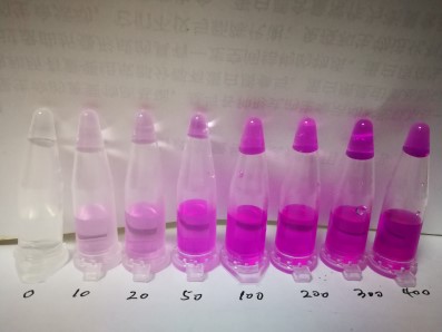 1.2:取2ml樣液于比色管(或比色瓶)中,加入50mg檢測試劑,放置5min后觀察顏色變化。
