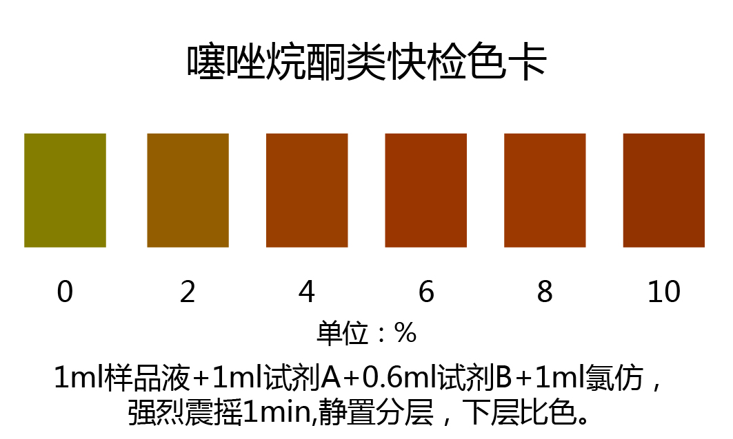 取上述濾液0.5 ml于玻璃比色皿或試管中,加入0.5 ml檢測試劑A,0.3 ml檢測試劑B,搖勻,加入1ml氯仿,強烈震搖1min,靜置分層,觀察下層顏色,對照色卡比色,噻唑烷酮類降血糖藥物含量越高,顏色越深;